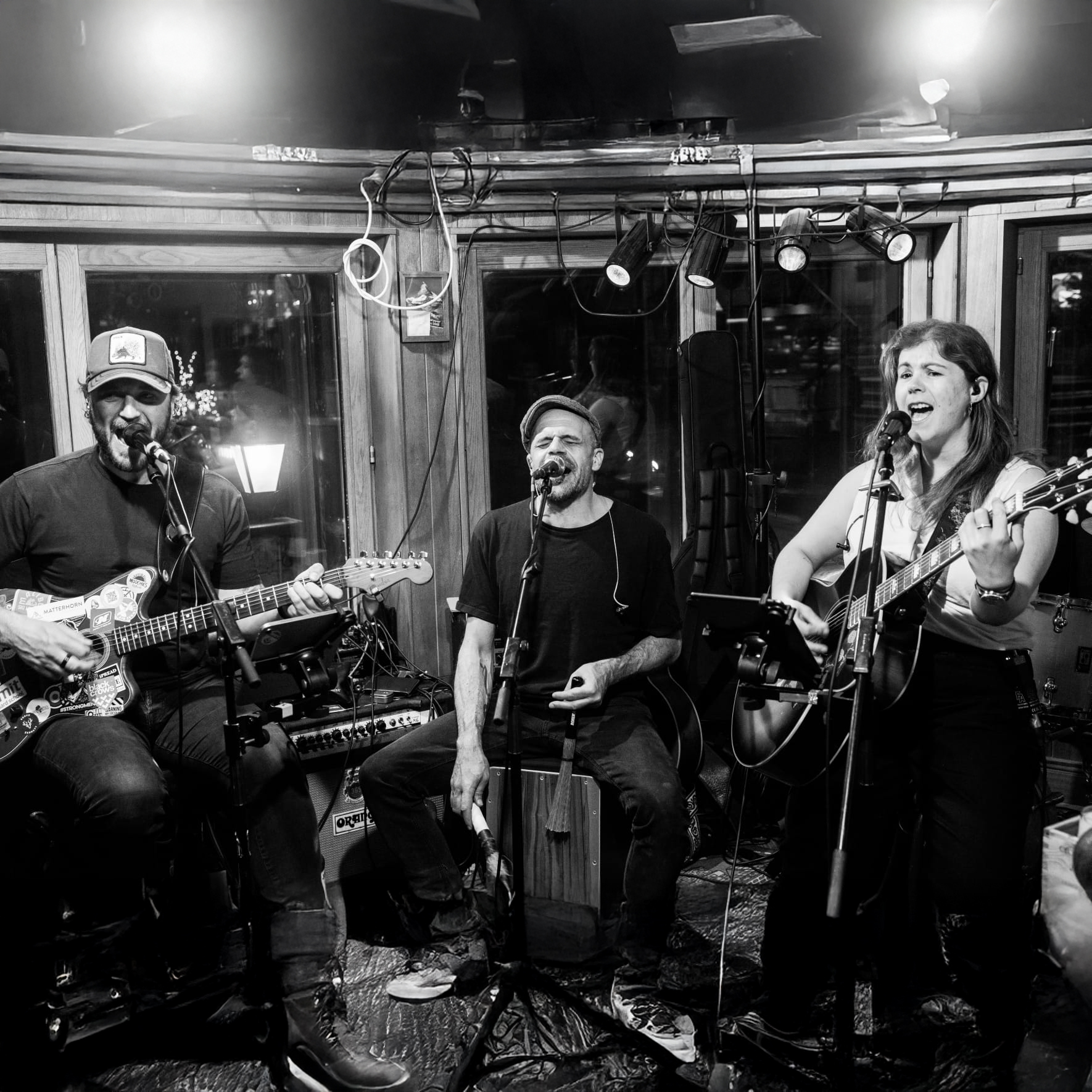 Le groupe Espresso Martini Club de Zermatt enchante son public avec Beth à la guitare et sa voix veloutée, qui va de Bon Jovi à Taylor Swift, Joe comme guitariste principal, chanteur et magicien du son, et Gio, le héros multilingue du cajón et garant de la bonne ambiance.